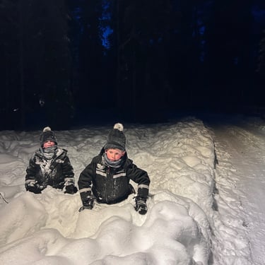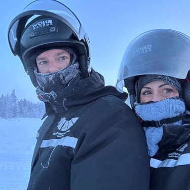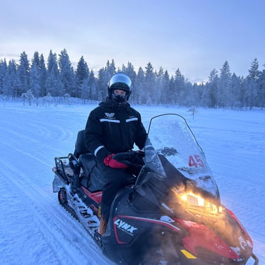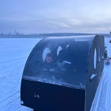 The snowmobile safari offered a very different kind of thrill, a proper adventure across frozen lakes, forests, and wide-open fells. Exhilarating, beautiful, and surprisingly peaceful. We were very grateful for the heated handlebars! The boys travelled in a heated sleigh towed by one of the guides while we followed on our own snowmobiles. A warm berry juice at the halfway point was especially welcome. Later that day, the boys were able to drive their own (smaller and less powerful) snow mobiles which was both thrilling and nerve wracking in equal measure!
