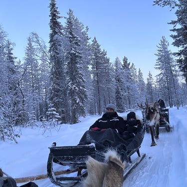 The outdoor adventures were incredible. Gliding quietly through the forest in a reindeer sleigh, wrapped in warm layers and listening only to the soft crunch of snow beneath us, was mesmerising and timeless. The boys were utterly captivated, asking endless questions and soaking up every second. A particular moment that stood out was the reindeer named Veeti, and his fascination with the bobble hats both my seven year old and I were wearing that day.